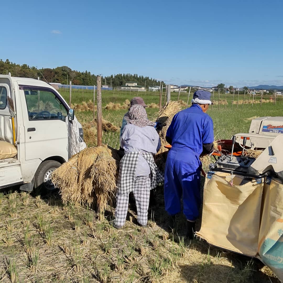 三種町の澄んだ空気の中、刈り取ったばかりの稲を一つひとつ手作業でかけていきます。